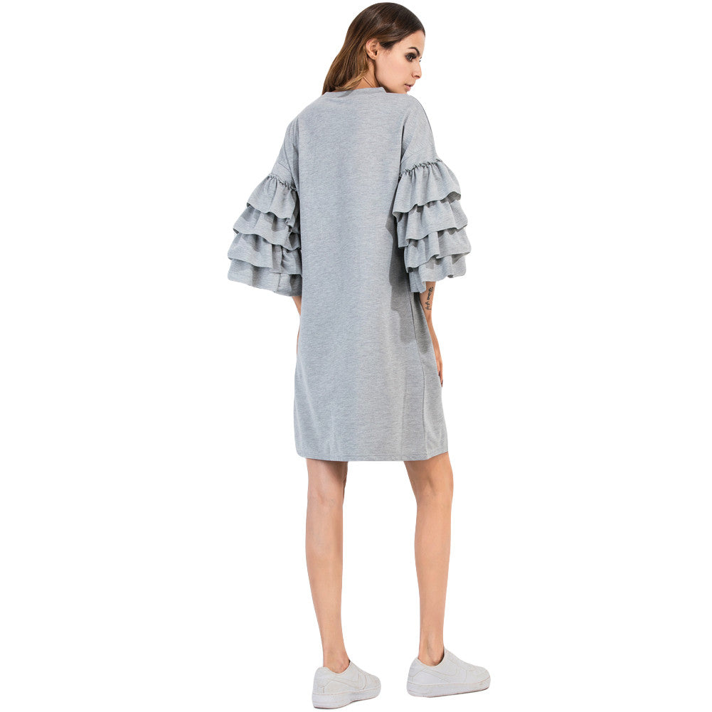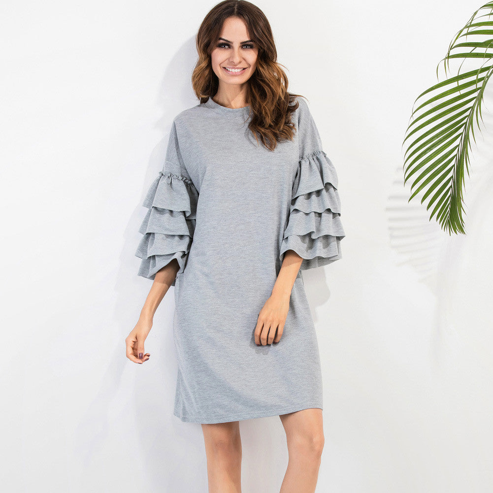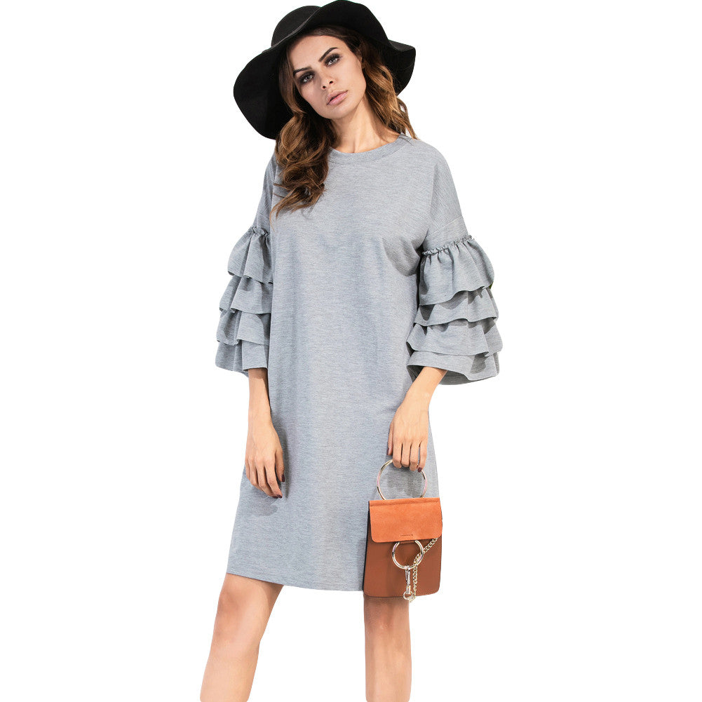 34 Multilayered Sleeve Womens Loose Dress Solid Round Neck Casual Plus Size Vestido Elegant Ladies Ukraine Dress Black